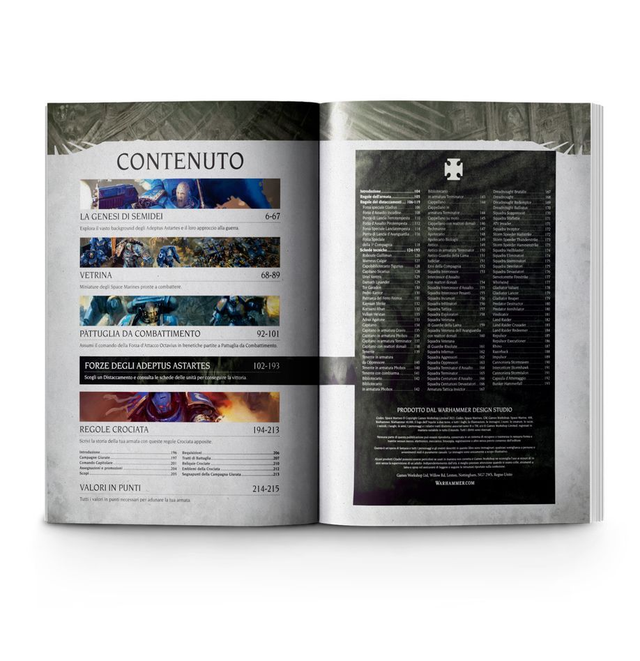 – 93 schede tecniche che descrivono nel dettaglio le regole, gli equipaggiamenti e le abilità uniche di ogni unità di Space Marines