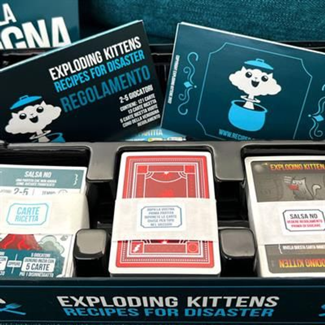 Recipes for Disaster ha tutto ciò che serve per giocare alla vostra prima partita di Exploding Kittens. Per i giocatori più esperti, sono disponibili tutte le migliori carte delle espansioni oltre che le carte Ricetta che presentano più di una dozzina di nuove varianti di gioco.