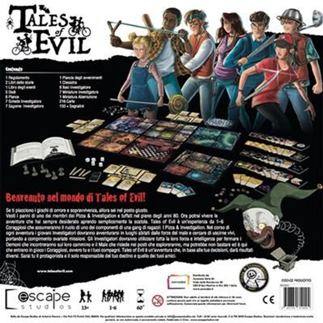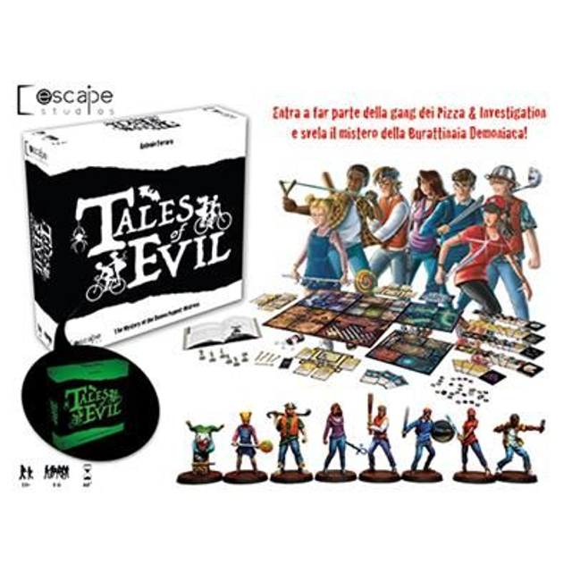Tales of Evil è un’esperienza da 1–6 Coraggiosi che assumeranno il ruolo di uno dei componenti di una gang di ragazzi: I Pizza & Investigation. Nel corso di ogni avventura i giovani Investigatori dovranno avventurarsi in luoghi abitati dalle forze del male e cercare di uscirne vivi, portando a compimento svariate missioni. Gli Investigatori dovranno utilizzare tutta la loro forza e intelligenza per fermare i Demoni che incontreranno sul loro cammino e il Male che risiede nei posti che esploreranno, ma potrebbe non bastare ed è qui che entrano in gioco i Coraggiosi, ovvero tu e i tuoi compagni!
