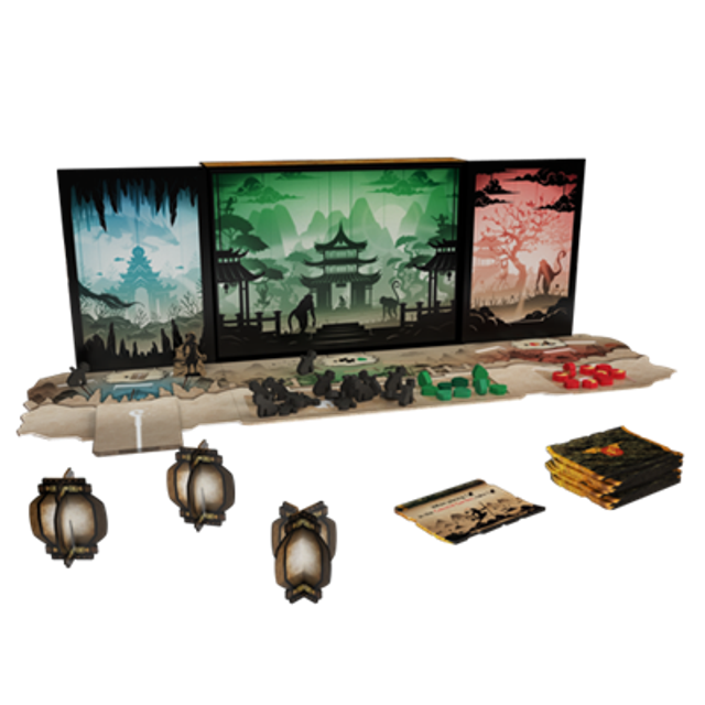 Contenuto: 1 Re Scimmia, 25 scimmie, 9 pesche, 9 pietre di giada, 1 plancia, 19 carte, 10 tessere Pergamena, 3 segnalini Lanterna, 1 regolamento.