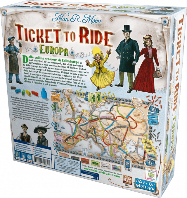 Un gioco di strategia su mappa, con pochissime regole. In Ticket to Ride Europa i giocatori accumulano carte di vari tipi di vagoni e le utilizzano per costruire stazioni, attraversare gallerie e viaggiare sui traghetti al fine di controllare le linee ferroviarie di tutta Europa. Più sono lunghe le linee, più punti guadagneranno. È possibile guadagnare ulteriori punti completando i propri Biglietti Destinazione e collegando due città distanti fra loro o componendo il percorso ferroviario continuo più lungo. Quindi salite a bordo e preparatevi a una divertente avventura sui binari. È ora di Ticket to Ride!
